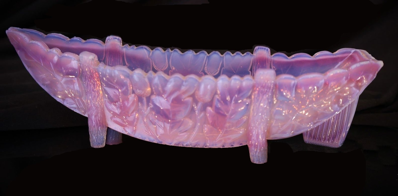 The item shown is the extremely rare Boat shaped Posy Vase. The color is "Rose Opalescent"
