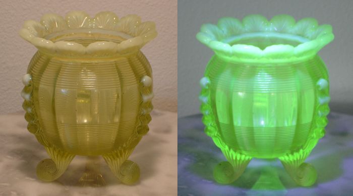 There are two words used in describing glass types. These two words are often confused by dealers and collectors alike. One word is Opalescence, and one word is Iridescence. Opalescence is what this price guide is all about. Iridescence deals with another type of glass called Carnival Glass. The following photos show the colors of Opalescent Glass that could be found during the "Victorian" and "Edwardian" era. The Edwardian Era lasted from 1901 to 1910, during which Edward VII (1841-1910) reigned as King after Queen Victoria died in 1901. ![]() Vaseline This color seems to be more on the Yellow side than Green. It will fluoresce under a "Black Light" as shown due to Uranium Dioxide in the glass. Some companies referred to this color as "Canary", and some called it "Vaseline", and some companies called it "Yellow". ![]() ![]() Blue The item on the left is simply "Blue" Opalescent. This color is sometimes called Sapphire Blue. Northwood made a pattern called "Diamond Spearhead" shown on the right. The blue color they used for that pattern was a darker color which we refer to as "Cobalt Blue" ![]() ![]() Green Some Green glass will fluoresce under a "Black Light". If it does, it is considered Vaseline. If it does not, it's just called Green. Northwood made a deeper Green color called Emerald Green Opalescent for their "Diamond Spearhead" pattern shown on the right. ![]() White White Opalescent means clear glass with Opalescent edges. Some companies actually referred to this color as "Flint Opalescent" in their catalogs. "Flint" referred to Clear Glass. Collectors today simply call it "White Opalescent" glass. ![]() Amethyst. This color was made by the Fenton Art Glass company beginning about 1908 They are the only American company to produce this color during the early 1900's. ![]() Cranberry Prior to 1921, the only way to get a Ruby or Cranberry color was by using Gold Fulminate in the glass batch. After 1921, the color could be made by using cheaper chemicals. ![]() Amber One of the earliest known companies to produce Amber Opalescent glass was the Phoenix Glass company in the 1890's. Then the Indiana Tumbler and Goblet Company of Greentown, PA in 1903. Their color was called Golden Agate. Collectors call it Holly Amber. The factory was destroyed by fire the same year so Golden Agate is very rare to find today. Amber Opalescent didn't appear again until the 1920's and early 1930's. The Fenton Art Glass company produced it for their "Cameo" line. There may be other early companies as well who made this color. |