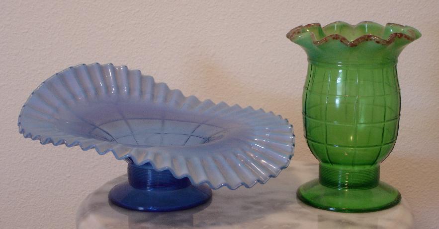 and a Celery Vase in Green Opalescent with a Cranberry Frit edge.