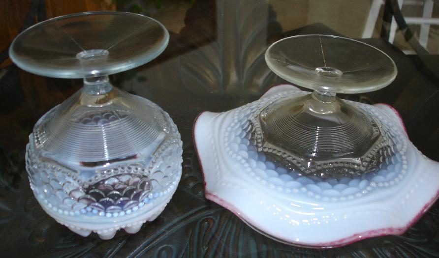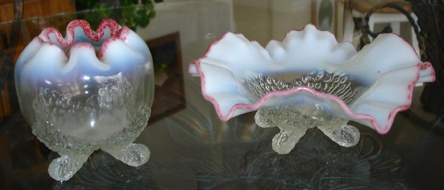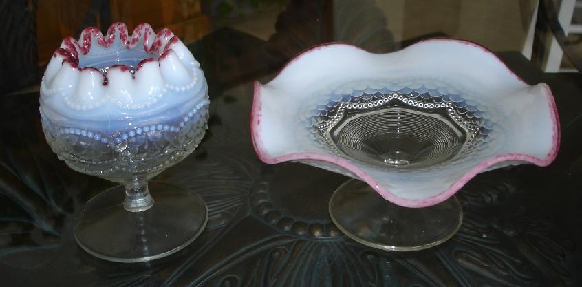 Left to Right: Rose Bowl and Candy Dish in White Opalescent with Cranberry Frit edge.