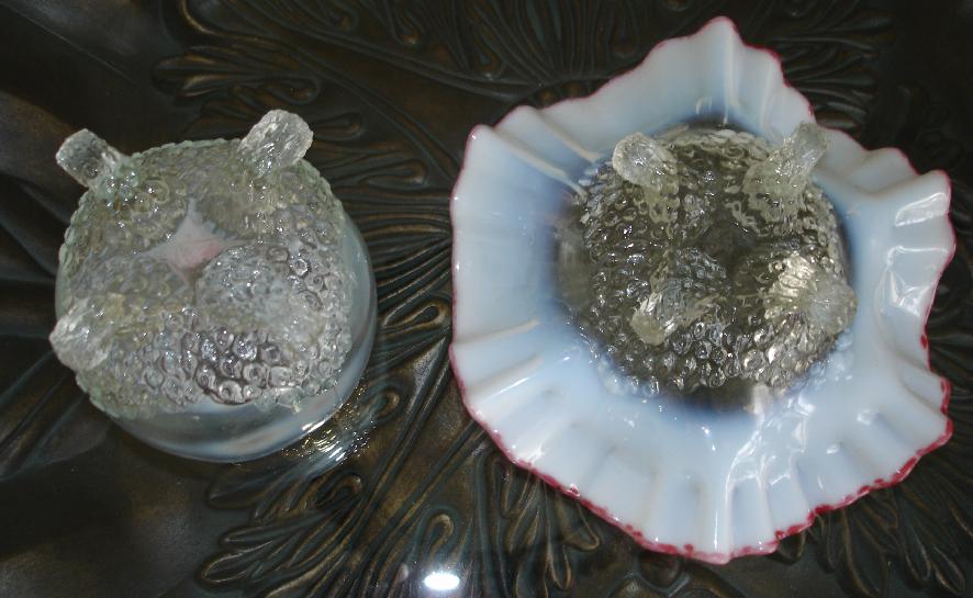 Left to Right: Rose Bowl and Card Receiver in White Opalescent with Cranberry Frit edge.