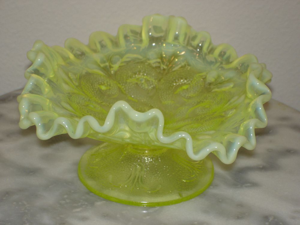 Vaseline Opalescent "Footed Compote". It has an exterior pattern of "Georgia Belle"