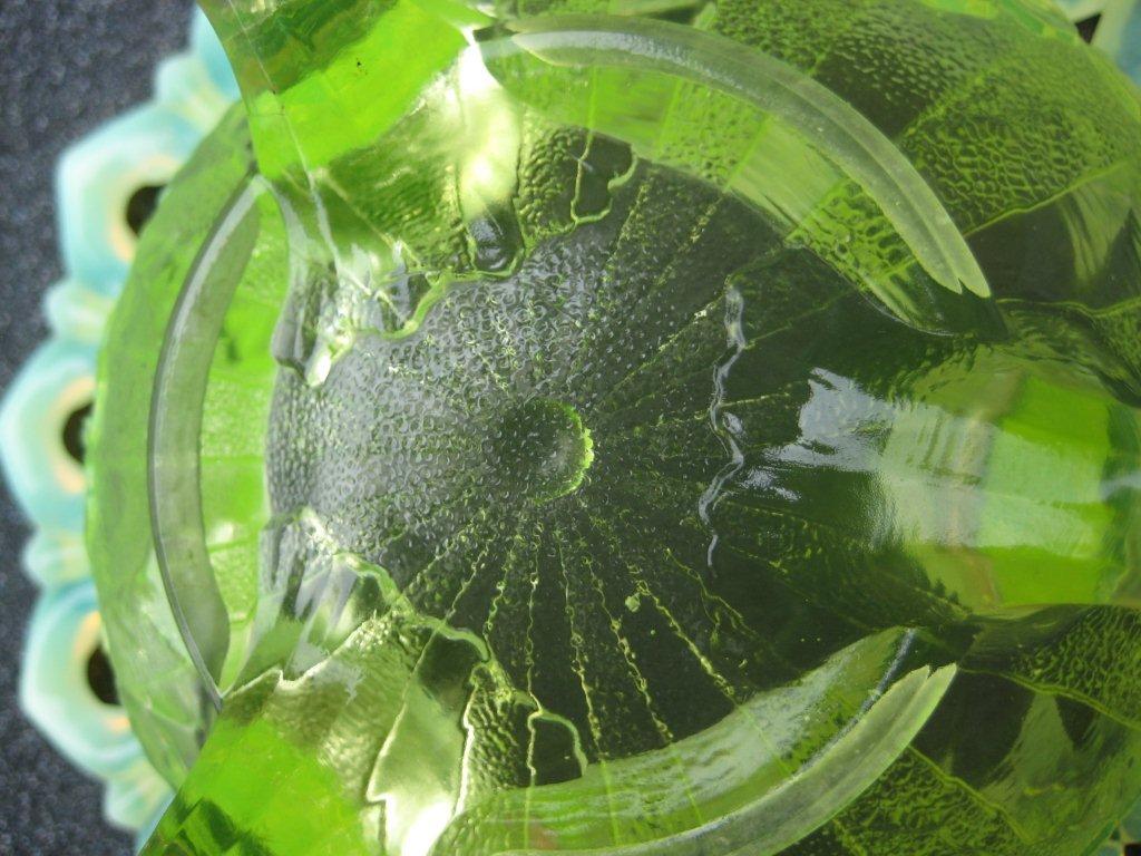 On the right is the flared bowl in extremely rare Vaseline. I've only seen two these in this color. One was