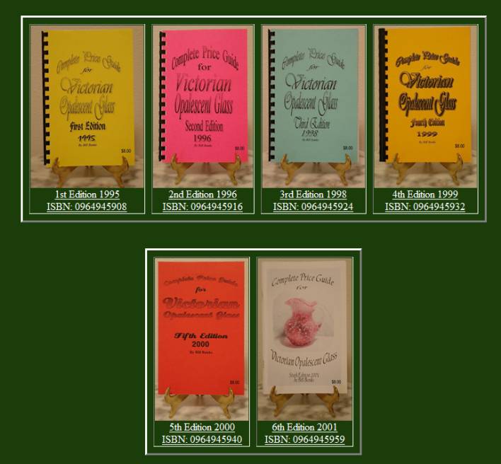 | Victorian Opalescent Glass Price Guide Prior Editions. The paperback priceguides do not contain photographs. They are a Value Guide only. The CD's contain color photographs. All of these prior editions are still available while supplies last. Contact Us |
