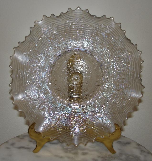 Item 1641 Fenton Leaf Chain Bearded Berry pattern on the reverse side Clambroth Iridescent 9" plate, ca. 1921 |