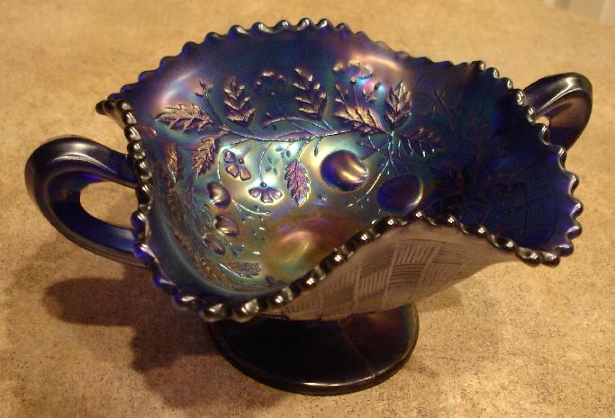 Item 2874 Northwood Fruits and Flowers Double Handled Blue Carnival Glass Stemmed Compote ca. 1910 |