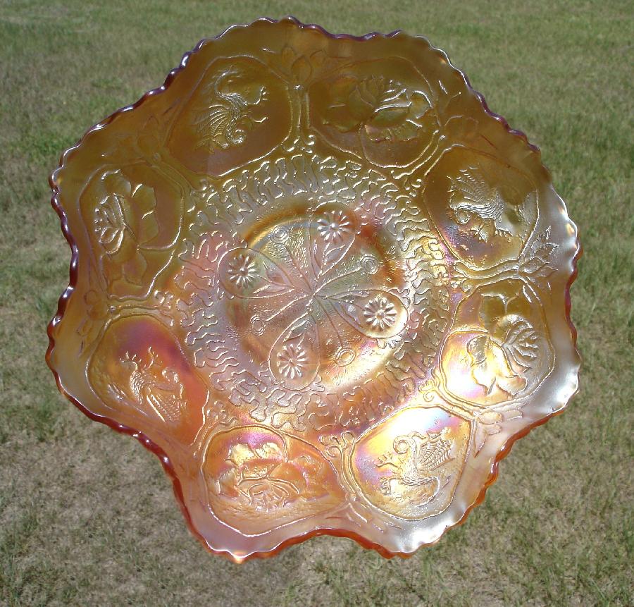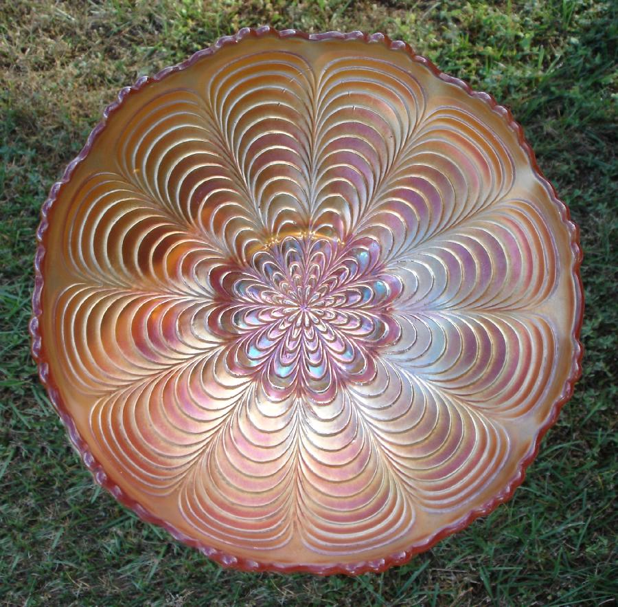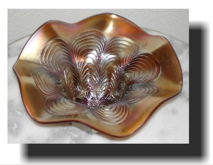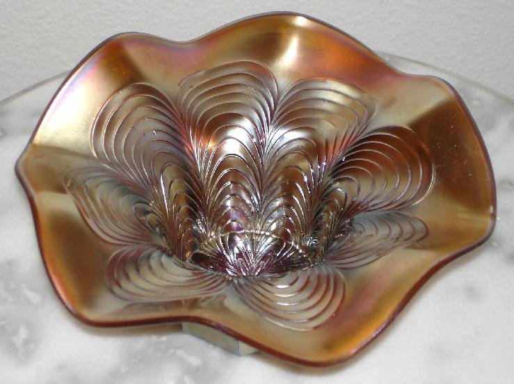 Item 3111 Fenton Peacock Tail Marigold Iridized Carnival Glass 7" Low Bowl Made ca. 1910 Sold |