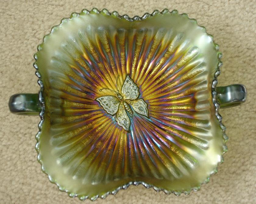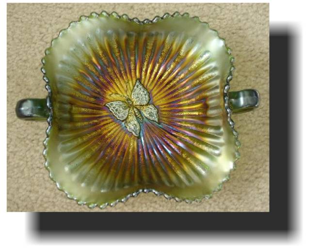 Item 2907 Northwood Butterfly Green Handled Carnival Glass Bon Bon signed N in a circle ca. 1910 Sold |