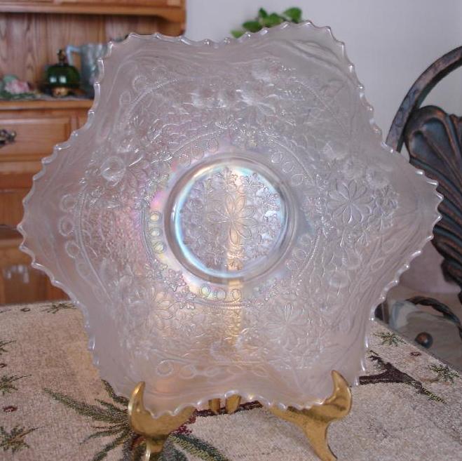 Item 2521 Dugan Fanciful 9" Low Ruffled Iridescent White Carnival Glass bowl ca. 1905 Sold |