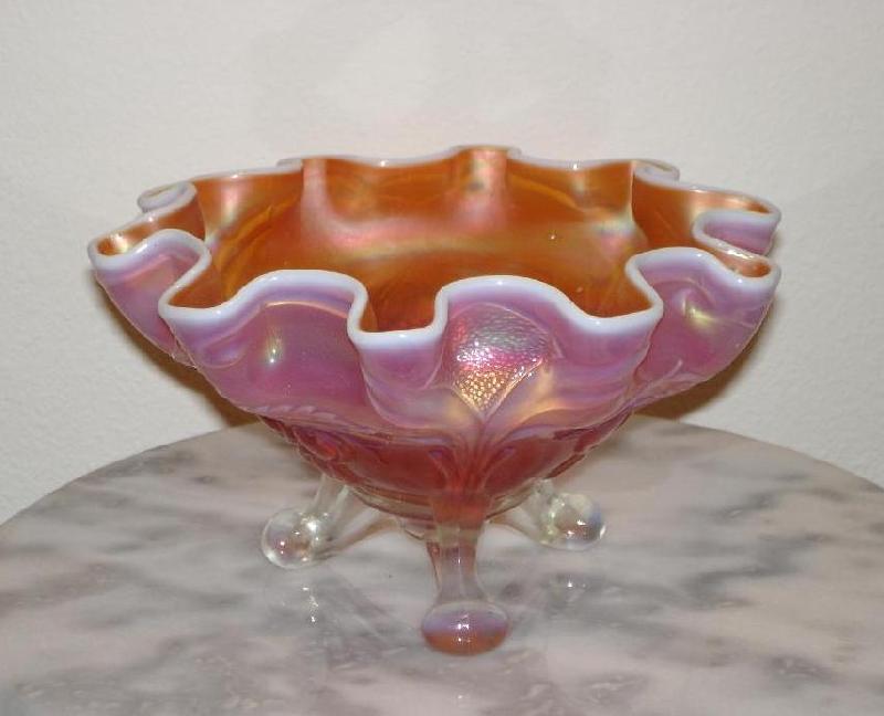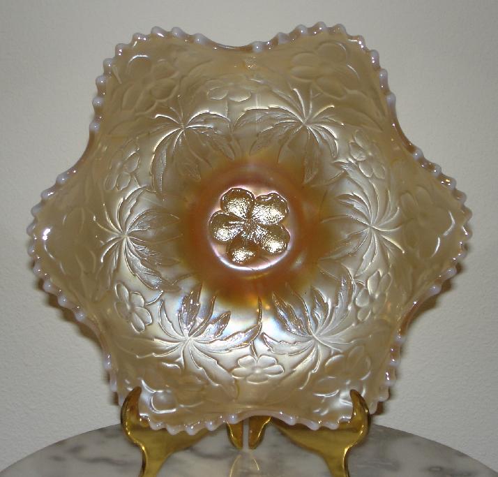 Item 3008 Westmoreland Carolina Dogwood 9" Peach Opalescent Iridized Ruffled Bowl ca. 1920's Sold |