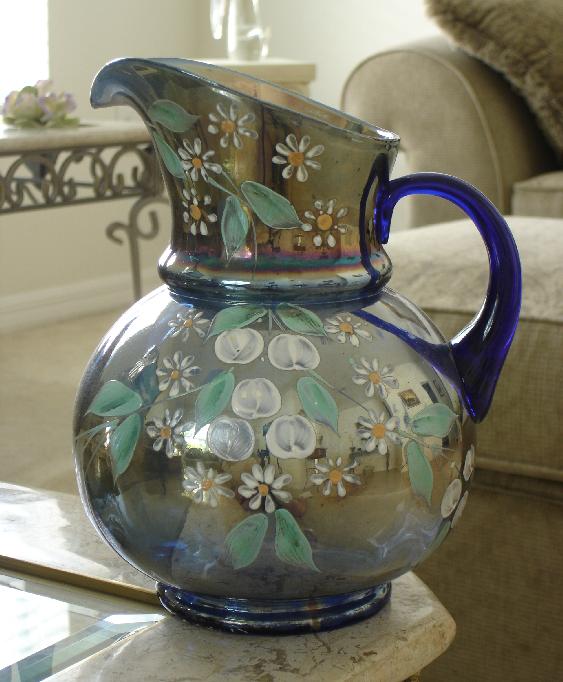 Item 3017 Fenton Cherries & Blossoms 10" Iridized Cobalt Blue Water Pitcher ca. 1910 Sold |