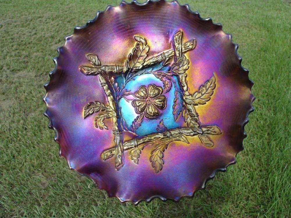 Item 3071 Dugan Amethyst Apple Blossom Twigs 9" Iridized Low Ruffled Bowl Sold |