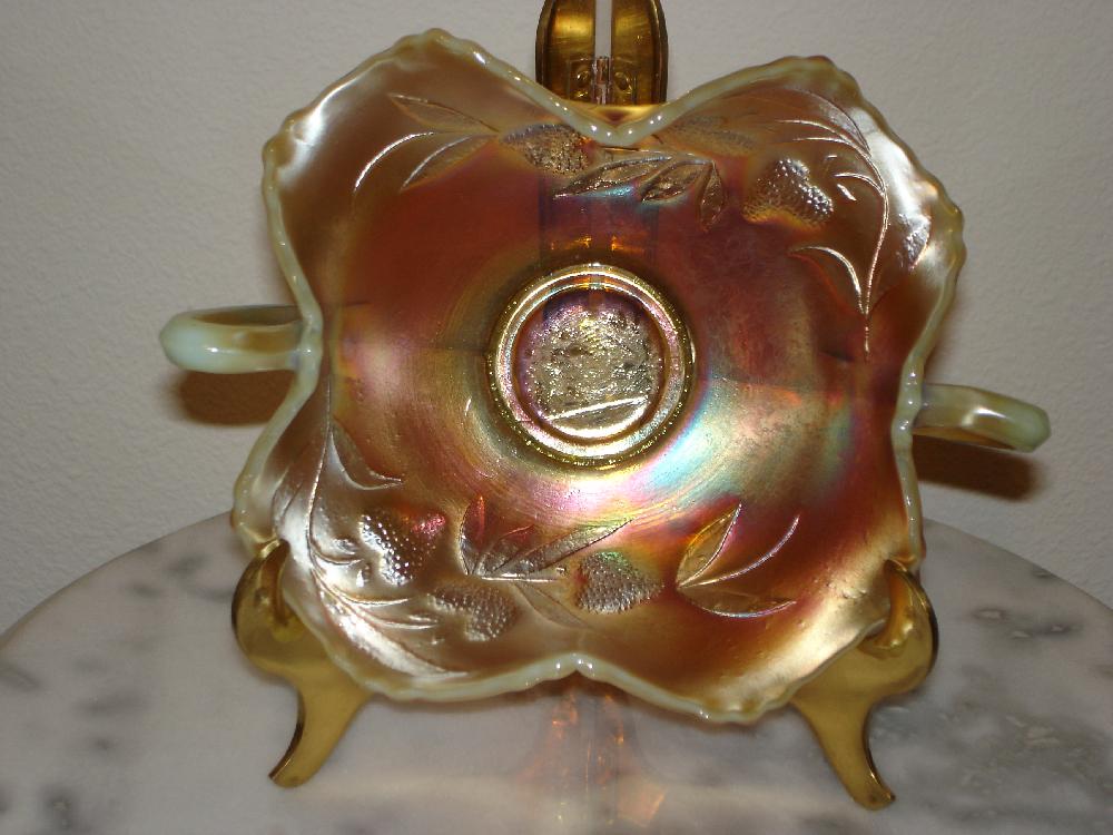 Item 3222 Fenton Strawberry Carnival Glass Vaseline Opalescent Marigold Iridized Bon Bon Made ca. 1917 Rare! Sold |