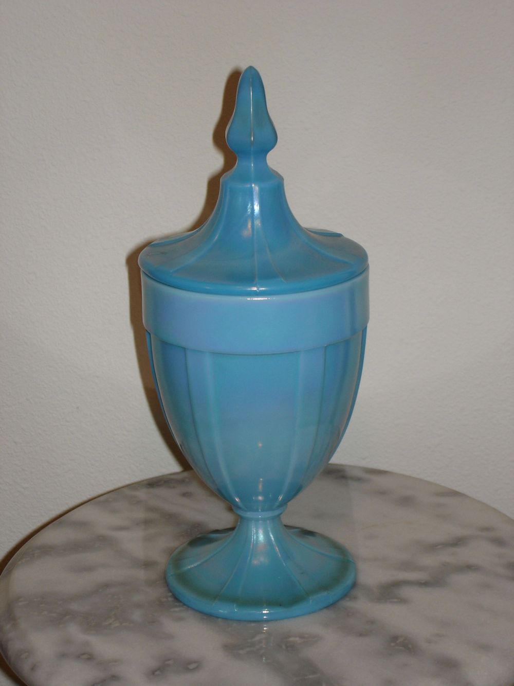 Item 3300 Northwood Jade Blue Stretch Glass 1 lb Candy Jar Made ca. 1921 Rare! |