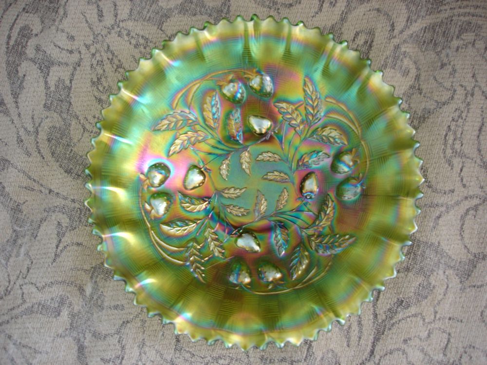 Item 4003 Northwood Green Iridized Strawberry Carnival Glass Ruffled Bowl Rare! Sold |