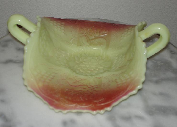 Item 2886 Fenton Custard Glass Pond Lily 7 1/2" diameter Handled Bon Bon Color-Stained ca. 1908 |