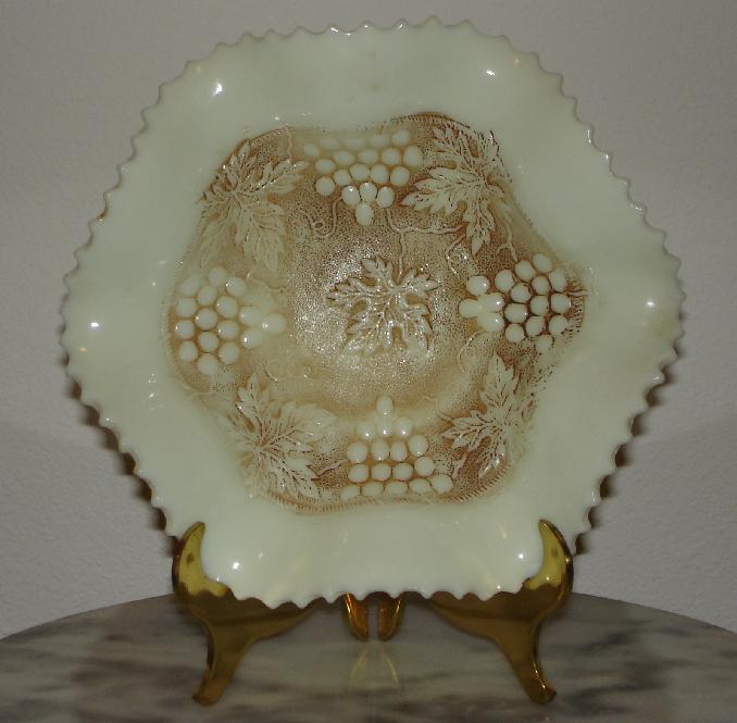 Item 2908 Northwood Custard Glass Grape and Cable 7 1/2" diameter ruffled Bowl with Nutmeg Stain ca. 1906 |